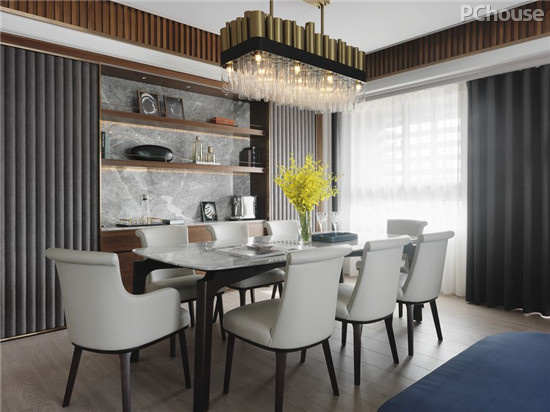 行至用餐区域,低调闪烁的造型灯具开启场域的新奇想像,上端略具仿旧感的圆柱体连接下方透明材质包覆的球体灯泡,集合工业裸空及古典华丽元素而成;细腻地将光泽撒上白石桌板与皮革单椅,替冷色调软件暖座升温,微塑家人用餐时的温暖时光。屹立一侧的开放式壁柜,则汲取天顶木质混合餐桌石板两种元素,框构出柜体骨架,并採撷吊灯的光芒意象,发展为层架后方的间接灯源,共构餐饮时光中的美丽风景。