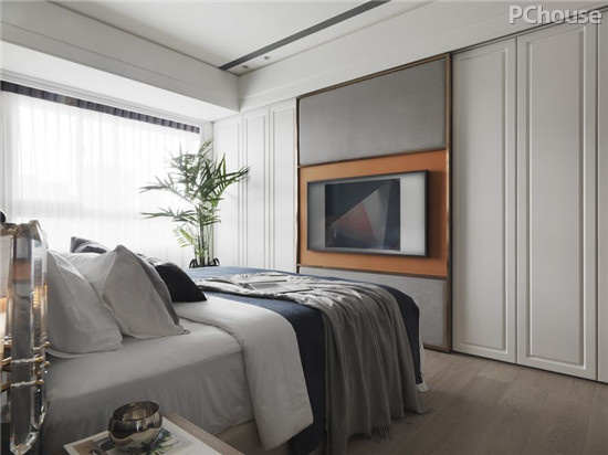 受公领域的宁静氛围簇拥来到主卧室,「方」与「圆」的空间语汇变得更加鲜明——设计师转化现代简约线条,以金属边饰强化场域的纵横感,并同时作为接合异材质的过渡媒介,将立面当作画布挑战多样化的色泽搭配。如电视墙以白色直立线板配合灰色块状绷布为周,暗橘色区块为心,自然地引领视觉聚焦中央;一方面凸显墙面主要机能,更于过程中构成一幅静谧画面,使人于氤氲满室的沉静氛围中悄然入眠。