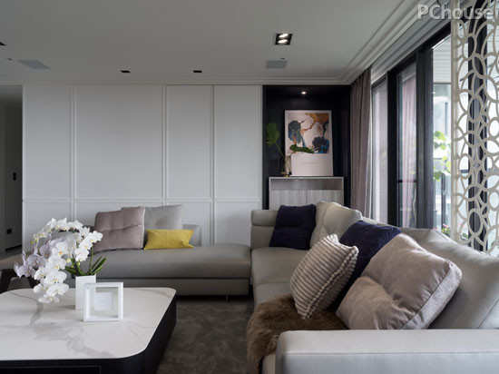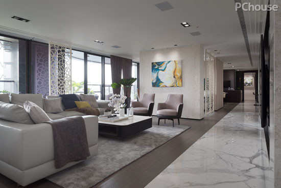 【太平洋家居网 设计频道】约两百平的狭长格局,面景而生,使空间产生全新的思考。已第二次合作的企业家屋主,由于先前合作的经验,屋主了解我们的设计与工程细化分工、工班按部就班施作、保固维修机制完善,因此整个过程沟通极为顺利愉快,也因为信任,而决定换屋后,依然把室内设计规划的重任托付给张馨所带领的瀚观室内设计团队。本次不同于前一次住宅的优雅美式风格,改以现代轻奢为主轴,并发挥项目本身座落地点远望绿意公园的优势,让长型空间有良好的串联性与延伸感,延揽令人感到心旷神怡的窗景,而这大空间依然有着小角落,给家人舒适的对话空间。