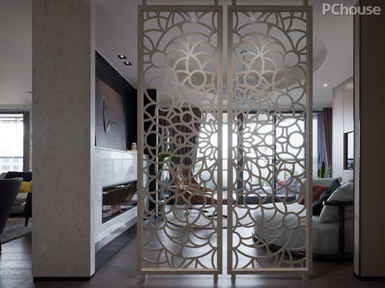 位于房屋的正中央,左右各有空间,因为窄向,所以我们以实化虚,以铁件雕花屏风作为虚的玄关,不让人一进门就可以立刻一眼贯穿至窗外的景色。