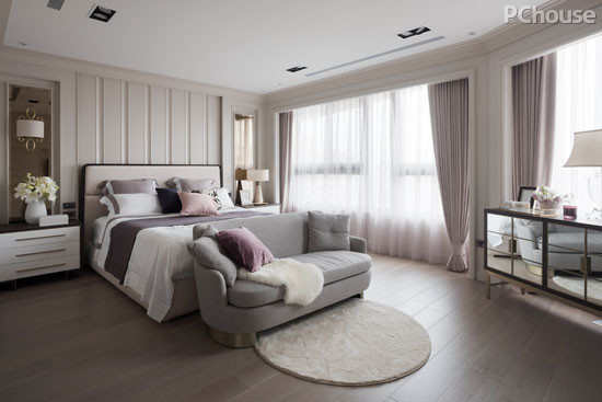 为制造安稳的睡眠区,我们以古典框切割大面窗,线条制造出温馨气息,只要再添加镜面柜体及锈蚀镜增加华丽度即可。