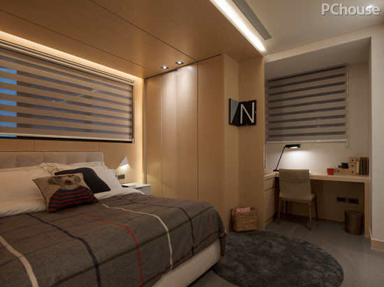 一室的木纹,宛若树屋般,给人安全感,考虑到此处的光线并不充裕,我们就以光带赋予灯光,满足居住者的生活实用性。
