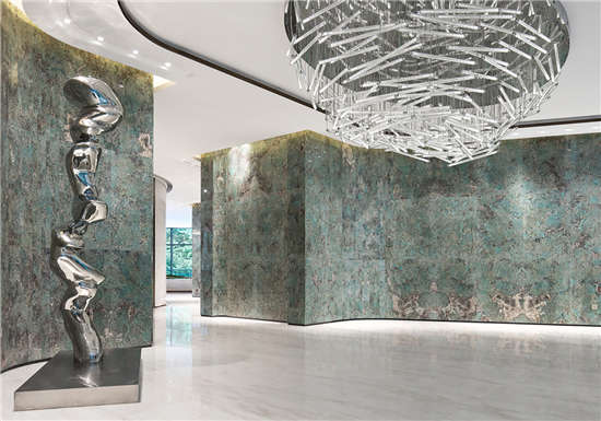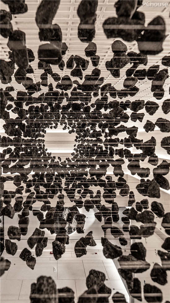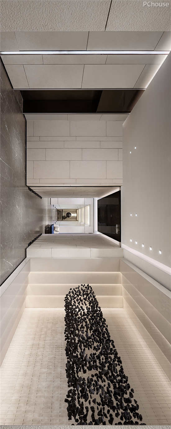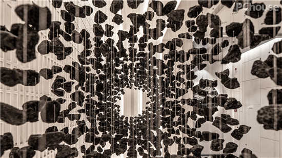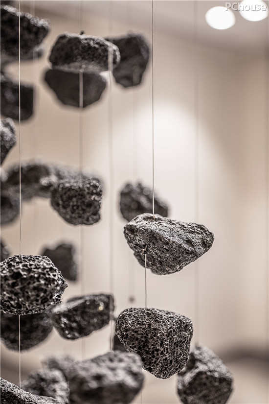 步入前厅,空间以炭黑色的装置艺术作品《无垠》担起序章,在白沙米黄石材搭建的梯度空间中愈显深邃观感。康德曾说过“美是对无限的眺望”,这数百颗天然火山石经由人工凿制而成,这一个个自然而质实的元素,以螺旋状在有限的空间中排布出无尽无限的永恒之美感,诗意地与自然呼应共生。