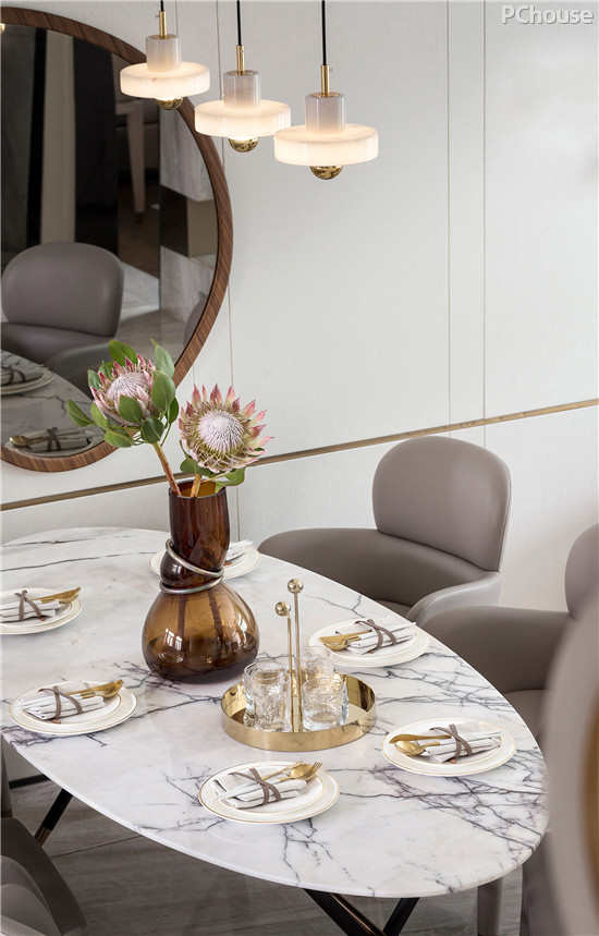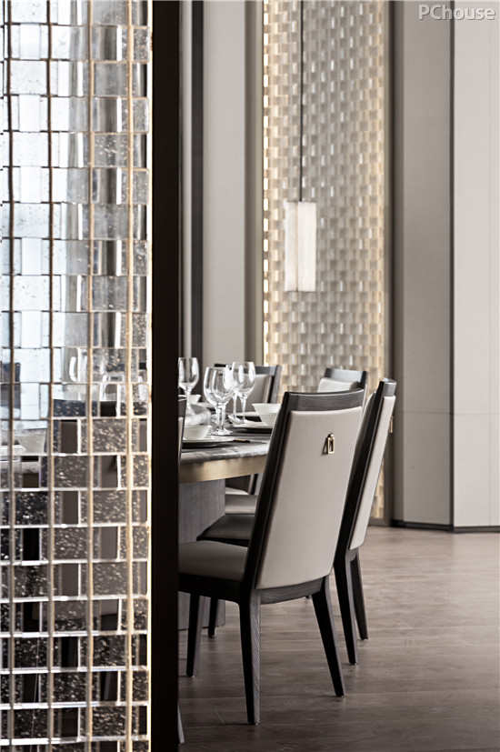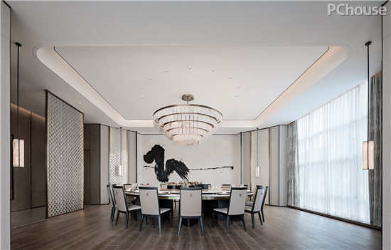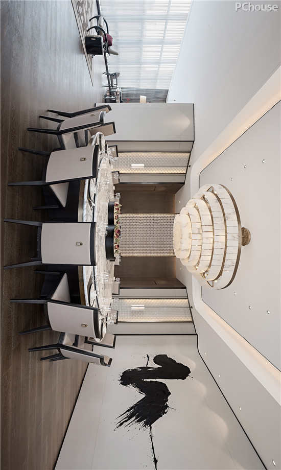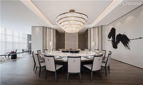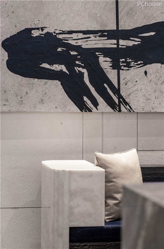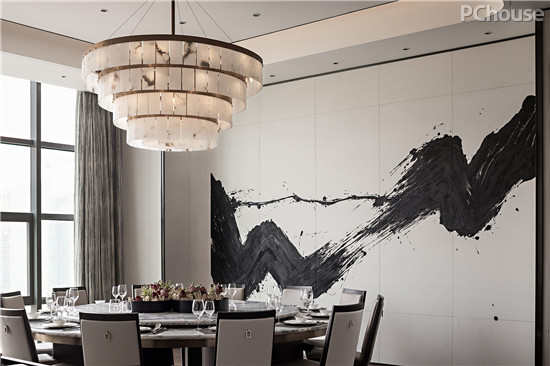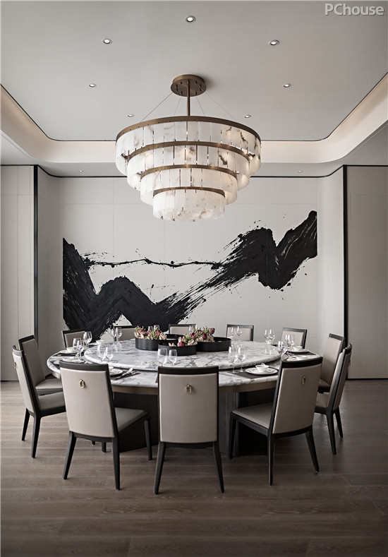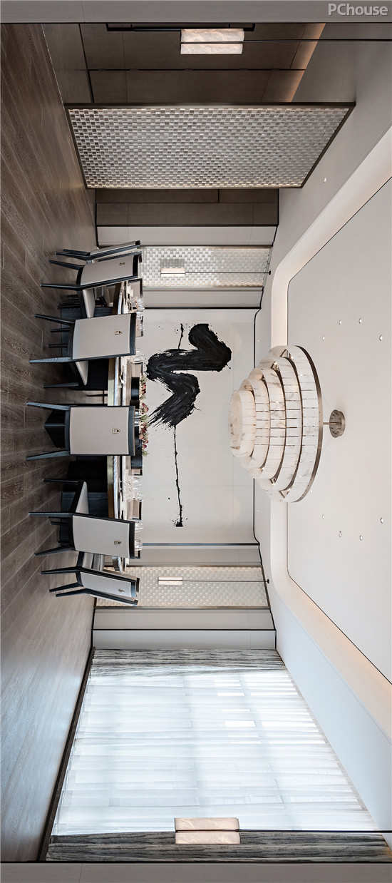 清透的水波纹亚克力屏风营造起私宴社交的安静氛围,大理石云纹灯与餐椅的风格形成呼应,写意禅意气息。墙面大笔触的水墨画作,以游走无定的苍劲笔迹,挥笔出虚实迭出的美学与丰润有力的内在精神,亦是自然与生灵变动不居、活跃有力的象征。
