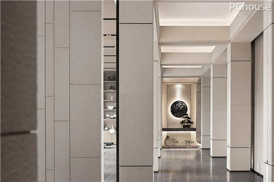 “游廊,方见深远而圆。”东方的象征性元素——圆,被运用在连廊端景各处,与长长的廊道相映,方中有圆,形成一种空间的平衡与补充。山水诗话的画面感,在简洁的硬装线条下,营造出一种远离喧嚣的灵动气质,悠然而别有韵致。