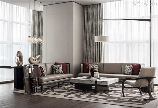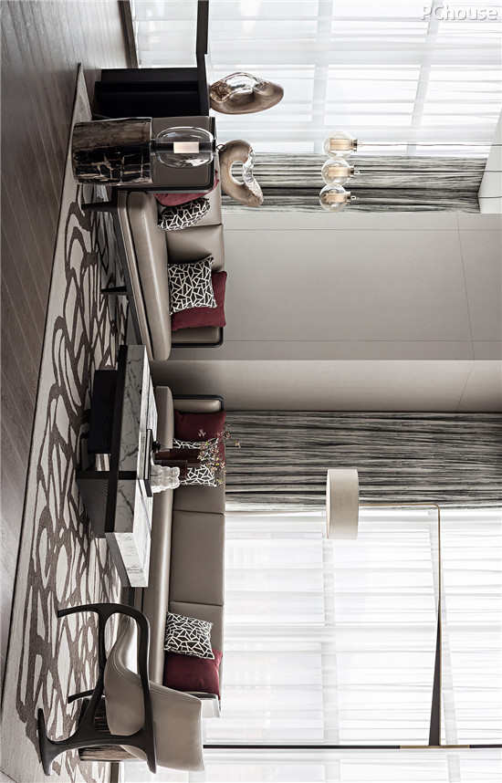 RALPH PUCCI的沙发搭配具有温婉雅澹气质的HOLLY HUNT扶手椅,纯粹而倍显高级感的配色,流露出当代与闲适并存的美学气息。大块棕白线条纹路的地毯搭配其中,建立波澜湖面的艺境之美,将空间植入自在丰盈的精神界域。