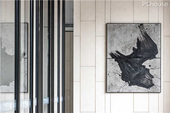 水吧台兼并现代极简的形制与东方文化的精髓,在现代与传统中柔缓过渡。置于墙上的画作,在书法的悠长古韵中寻得现代的表现形式,笔墨淋漓多变,用笔刚健有力中别具秀逸之韵。简约的各式部品形制,搭配展示柜上当地的制瓷文化,在小小的空间内搭建起强大的艺术表现力。