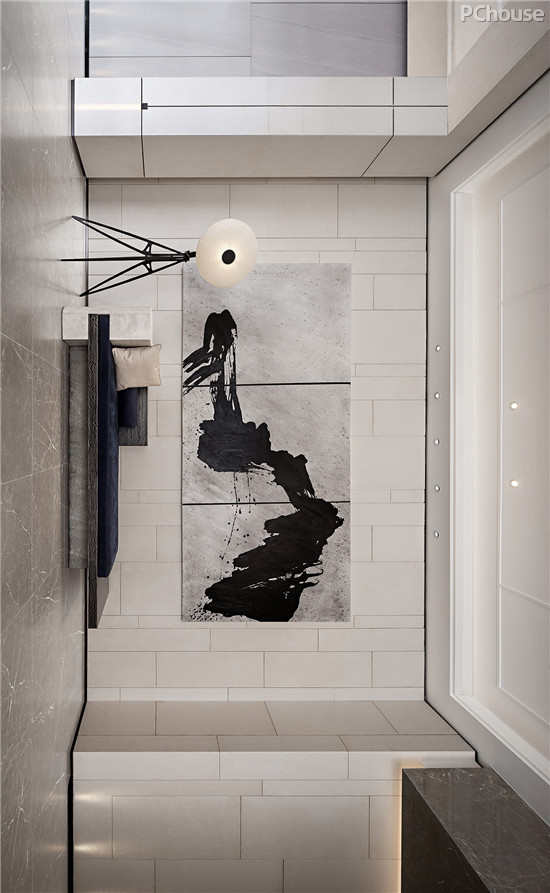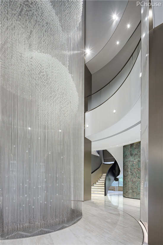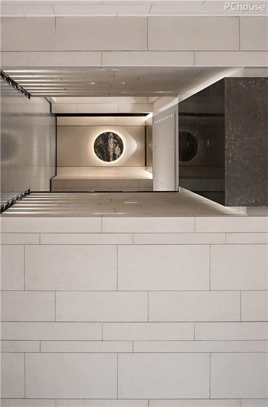 接待休息区构置的艺术沙发,其大理石与绒面的搭配,素白与深灰的相映,刚中带柔。Stellar Works的落地灯用核桃木与和纸材料制作,透着隽永的东方情怀。在此,观者不仅可感受到节奏上的起伏离散,更能被带入冥想式的思绪中,与设计一同溯回东方。
