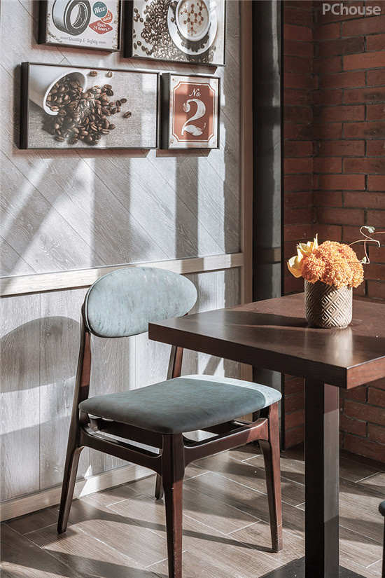 栗红色和灰蓝色的混搭,让怀旧空间中透露着一些清新。墙面配以 “POP艺术”风格的挂画,在光影下别一有番感觉。