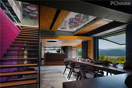厨房采开放式规划,结合中岛完善机能,为满足家里经常高朋满座的盛况,柯竹书与杨爱莲设计师特意挑选由整棵树干剖面而成的原木长桌,厚实温润的质地与长向尺度,阐述东道主的生活品味,相伴一场场大啖飨宴、把酒言欢、或是促膝交谈的相聚时光。 丈量基地时曾发现蜂巢,柯竹书与杨爱莲设计师以此为灵感,将二楼天花板设计为蜂巢造型,并随着管线位置筑巢,以最少的面积藏入必要的空调、管线及照明。大量原始板模的质朴灰韵,释放空无气息,为避免过于清冷封闭,借由丰富明亮的色彩点缀,让家族小朋友来玩时,能感受爱丽丝梦游仙境的趣味与戏剧效果。小孩房的卫浴入口也特地以桃红画框加镜面设计为隐形门,营造犹如哈利波特密室的惊喜。游走室内外,时尚、华丽与自然、侘寂和谐对话,激荡了感官也濡染了心境。