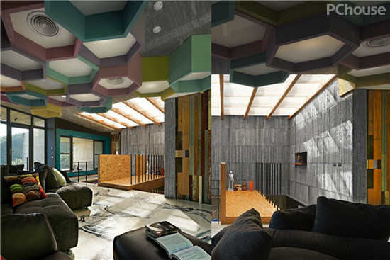 编辑点评: 以拟自然的六角形蜂巢施作天花,随着管线及照明的需要的位置筑巢,七彩色调为灰阶底色挹注梦幻气质。