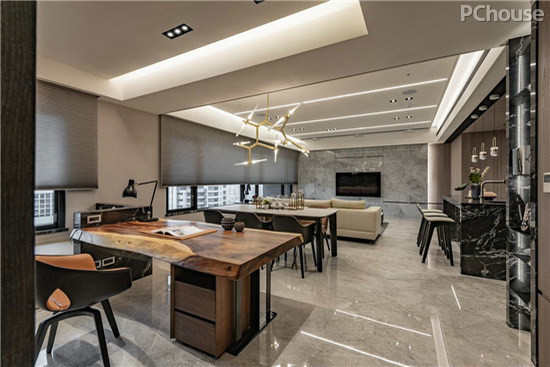 编辑点评: 依著屋子长窗,由前至后陆续配置了客厅、餐厅以及书房,让各处皆能享受丰沛日光的霑溉。