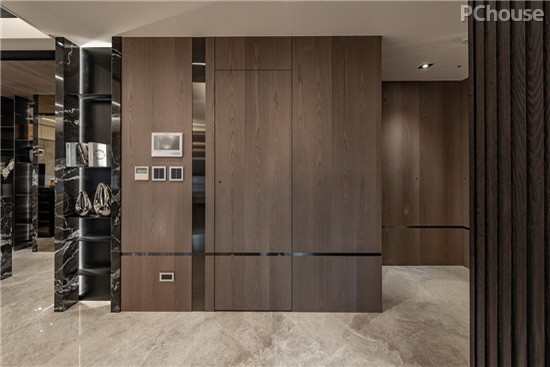 编辑点评:由楼层梯厅入主屋后,张静峰设计师利用一道柜体形成屏风般的遮隐效果,以此围塑出玄关。