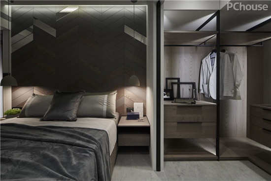 编辑点评:充满现代感的几何拼贴床头主墙,温润木质、时尚镜面与沉稳深灰,交织出时髦个性又不过于冰冷的空间氛围。