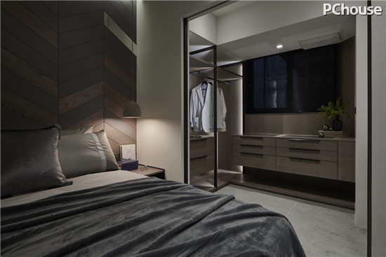 编辑点评:有别于公领域的个性灰黑,轻浅又不失个人风格的主卧空间,围塑出更轻松的眠寝空间,黑色柜体搭配金色把手,不着痕迹点出空间质感。