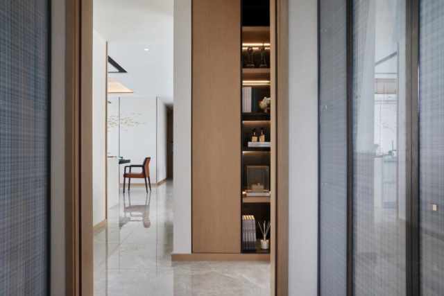透过木格栅,主卧亦可一窥衣帽间的风采。展示性与功能性兼并的衣帽间设立于走廊尽头,设计师在不经意的笔触中,将低调奢华的高贵感勾勒而出。