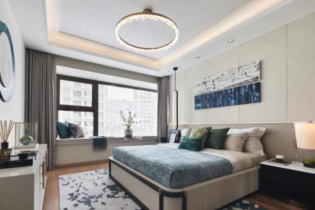 主卧床背与床一体化设计,空间关系更加完整,隐藏灯带的设置,运用光与影营造温馨与时尚氛围。床头灯具以高低错落的组合形式打破常规,提升层次。立体感极强的挂画,为主卧的视觉焦点,家具造型也更为凸显现代气息。