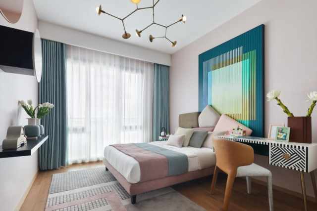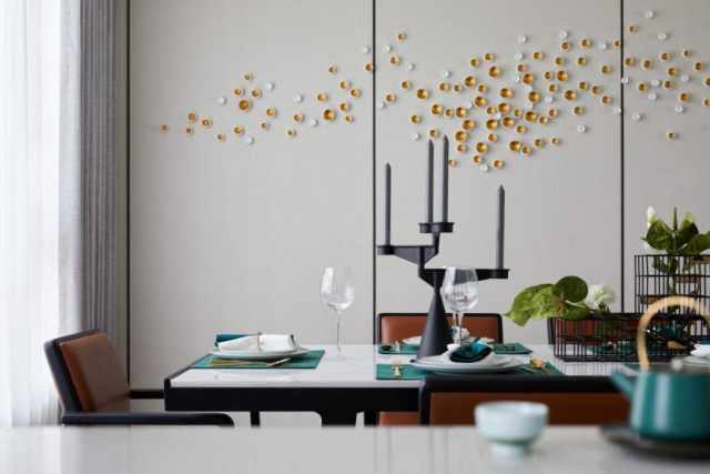 餐厅与客厅、厨房呈开放之姿贯连,将空间尺度拉升到极致。餐厅内欢快的撞色更易调动味蕾。定制的白金手工拉膜打造墙面艺术装置,由点及面,绘制出起伏形状,似云似水,通过有机图案、重复序列和反射光创造出流动之美,同时也与客厅的山水艺术画相互呼应。