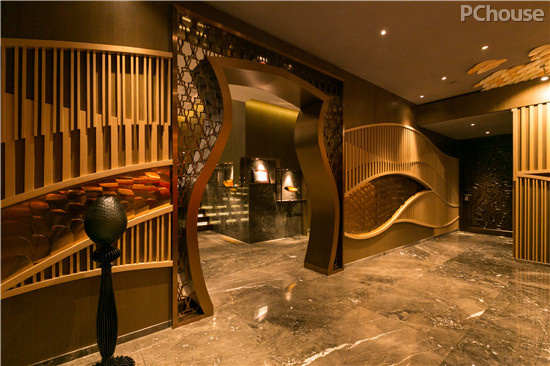 天花吊灯材质古朴,同样的造型延续到墙面,加以镜面辅助,将空间感发挥到极致,让客人在广州迷人夜色里尽情地放松身心。