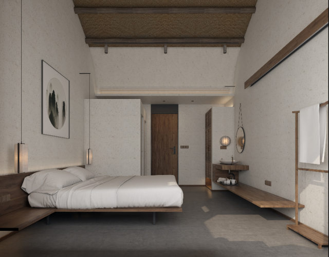 【潘悦】当我们确定民宿改造的主题后,材料无非就是在美学上和功能上的实现。我们没有选择很特殊的材料在里面,而是当下施工都会用到的非常普通的材料。我们这次在硬装改造上会用到夯土墙的艺术呈现,我觉得古朴就是一种美,故事就是一种美,这种墙面处理更适合乡间民宿的一种居住感觉,更容易让人一眼看到以后回归到儿时所接触过的居住环境,感觉到很纯粹的自然之美,打造属于她独有的辨识度,以及当代建筑艺术返璞归真的一种辨识度。