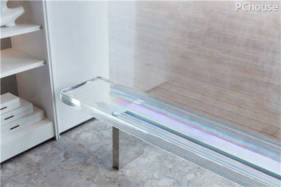 艺术是丰盈诗意的,而艺术孕育的过程是漫长的,一如凤凰浴火,方能涅槃新生。二十多天的锤炼,才等到钢化玻璃最终锻造出水纹的天然纹理,反射出七彩阳光。一灯一椅,从平面变成立体,从想象成为现实,皆是身为设计者的欢喜。