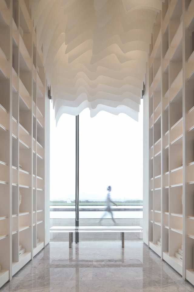 从沙盘区经展厅至休息区,开阔的视野望出去,山、水、田野皆入眼底。一窗之隔,黑白或渐变的颜色,极简的笔触勾勒出让人宁静的几何线条。天、地与人的和谐, 在厚重的山石与静淌的流水间渗透,动与静,柔与刚,于空间之中静默交流。