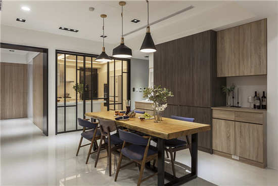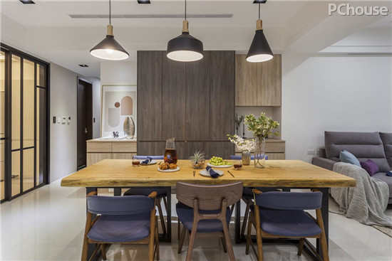 编辑点评:周建志设计师选用多款木皮设计墙面柜体,入门后随即能感受到温润自然的木材气氛,而餐桌上的饭菜香气,更能让辛苦一天的家人感到幸福。