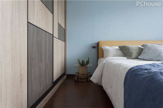 编辑点评:淡蓝色床头主墙让孩子房看起来更活泼有朝气,春雨时尚空间设计透过收纳柜搭配不同造型木皮与黑色线条分割,提升个性感。