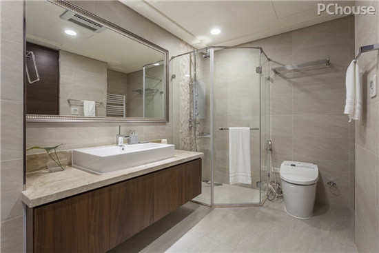 编辑点评:卫浴风格延续整体设计语汇,搭配石纹磁砖壁面与木纹浴柜,机能面采干湿分离,大尺寸镜面可让空间看起来更宽阔,木质浴柜下方悬空方便清洁。