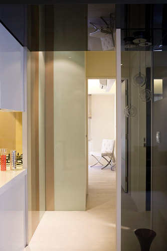为了不使进门时空间过于侷促、同时视觉看穿整个空间,设计师设计了悬空而透光的玻璃隔屏,成为区域的界定因子。