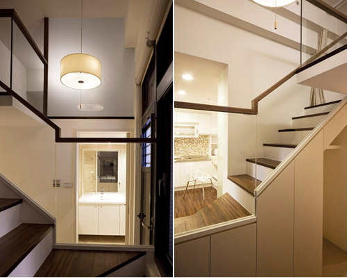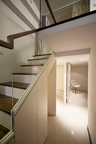Point1:因是两户打成一户,透过楼梯区隔了两户,而使用清玻璃的楼梯扶手造成视觉穿透,两个空间又联系起来。Point2:楼梯挑空,看见上方的储藏室落地喷砂玻璃,而吊灯除了负责狭长通往后阳台的阴暗走道照明外,也成了上层及挑空区一个视觉落脚的点。Point3:梯下空间用简洁的线条呈现,为屋主争取有利的储藏空间。