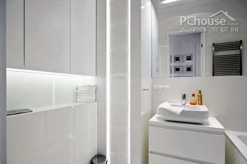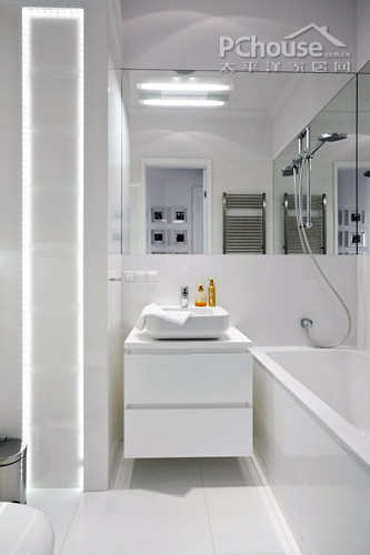 编辑点评:白色的浴室在配以灯光,未来感十足,当中的光柱从这个角度看犹如一道水柱,非常亮眼。一旁白色的橱柜保证了浴室的收纳性,当中的平台也可方便随时拿取物品。