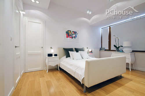 编辑点评:公寓里的主卧室拥有一间浴室,在其门口安置了一个高大的衣橱,超强的收纳性便于沐浴更衣,并借此分隔了空间,弥补了太过空旷的不足。