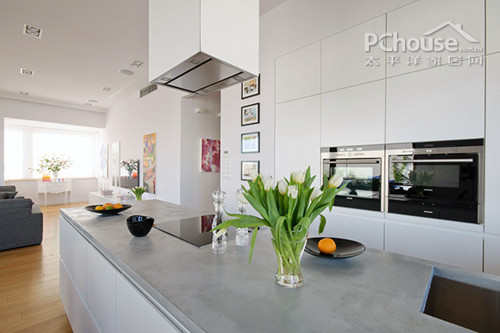 编辑点评:公寓拥有一个开放式的厨房,白色的厨具、橱柜令整间厨房显得干净、整洁,而灰色的台面则增添了一丝朴素与温暖。