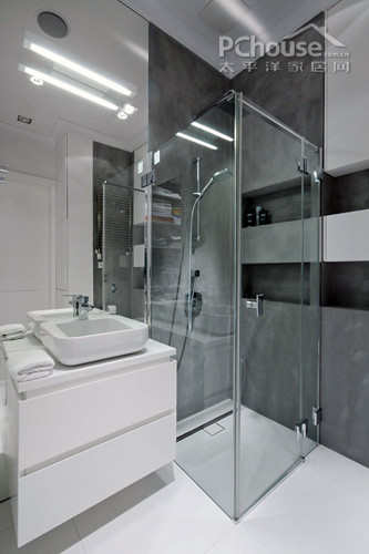 编辑点评:公寓里的另一间浴室,采用了玻璃浴房的设计,与之前的浴缸想对应,多了一种不同的选择。除此之外,其他的设计与之前大同小异,保持了一致性。