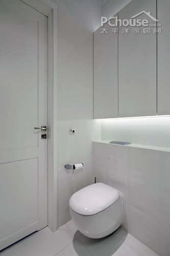 编辑点评:浴室里的座便器设计的非常小巧,白色烤瓷表面反射着灯光,显得非常干净。这样的设计也是节省了浴室的空间。