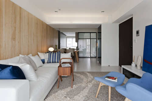 甫入客厅,大面积立面沉稳带出沙发背墙存在,饱和的蓝大胆跳色让视觉有了彩度注入。白色基底、淡雅木色,让家私轻松转化为空间主角。