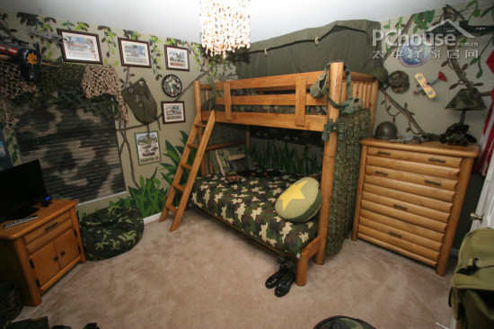 热血人物形象、带车、球类、狙击游戏等等都是男孩们最忠实的朋友,将军营的迷彩色融于卧室设计,虚拟的场景反而能带给孩子们最直接最真诚的保护。