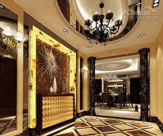 门厅用天花与地面互相呼应,立面与柜子结合一个背景的设计体现了门厅的大气。