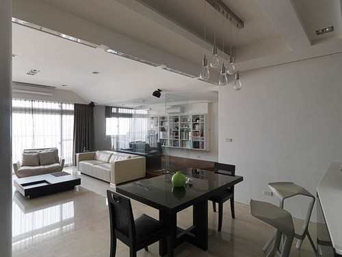 客、餐厅位于同一个轴线里,故TV设计上以活动方式规划,通透而具线性的张力,同时将空间轻量化。