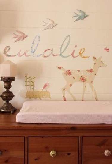 墙上的小鹿、蝴蝶、小鸟等都是用纸剪出来的,生动、可爱。用这样的方式培养孩子的创造力,想必孩子一定会喜欢。