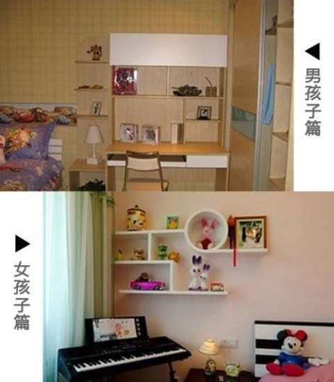 典型的男孩子房间肯定会放着许多玩具模型,坦克啦,超人啦,他们总是玩的不亦乐乎;女孩子的房间则会摆放各种的玩偶,尤其床上肯定要放着一个抱着入眠。