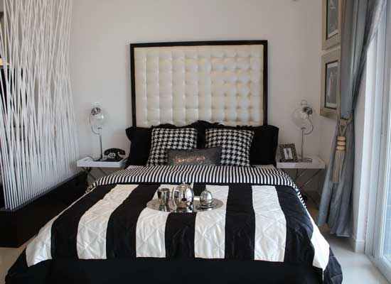 黑白线纹的床上用品,让空间很有层次感。软弱床头墙更是将卧室的高贵体现出来。