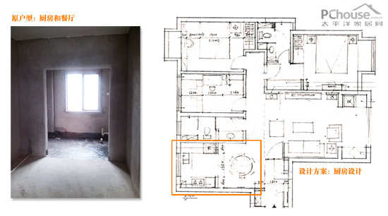 厨房餐厅设计:1、厨房加长隔墙至600cm,作U型厨房;2、加长隔墙后要注意预留嵌入式烤箱位置。