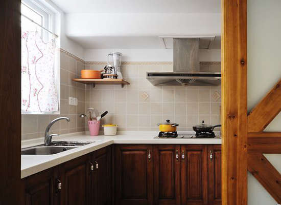 深棕色的橱柜在此也显得十分独特,这个厨房的上空就感觉要宽阔不少,没有那种拥挤的感觉。