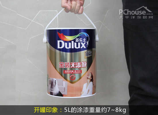 用手掂量油漆的重量,5L的涂漆重量约7~8kg,涂料在一般情况下,涂刷面积约13-16㎡/L/层。晃动漆桶,无明显的声响,说明此款涂漆浓稠度与黏度足,为优质的乳胶漆。