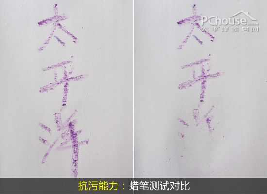 接着,以蜡笔在刷上涂料的测试纸上进行写字,并以湿抹布对写上去在字迹进行反复擦除,从擦拭蜡笔笔迹的情况来看,可擦除程度约80%的字迹,可擦除的相对干净。