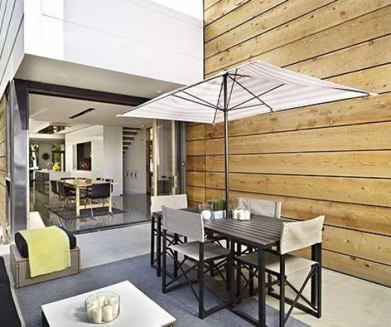 餐桌一旁还特地添置了2把松木躺椅,表面的年轮纹理呈现垂直线条,这样的切割法让木料更为耐用,适合放于户外。后方正是盆栽的所在,空气新鲜无比。