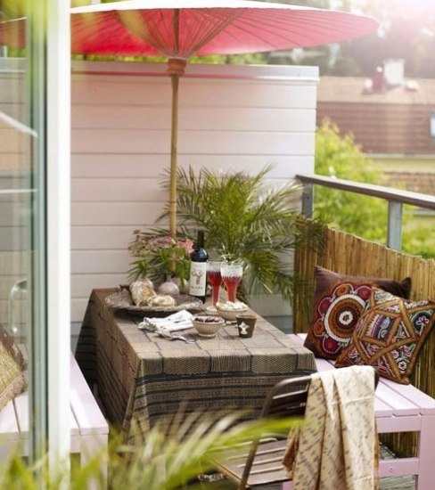 空间极小的露台空间,却正好能打造成绚烂户外小餐厅。一款素色桌布,轻松让角落盖上田园气息。而粉色长凳与遮阳伞,则提升了整个空间的年轻感。