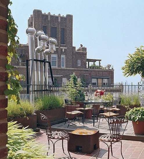 露台外围全都以矩形花坛围绕,中间添入大型盆栽增加花园的绿元素,中间部分是经典的餐厅摆设,不仅有可供多人享用的圆形餐桌 ,还有可供夜聊的火炉。